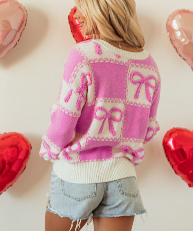 Light Pink Embroidered Bow Lantern Sleeve Oversized Pullover Sweatshirt