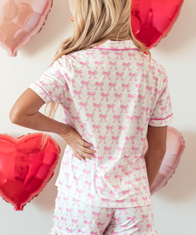 Pink Bowknot Printed Short Sleeve and Ruffled Shorts Pajama Set
