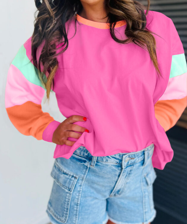 Fushia Mixed Print Raglan Sleeve Ribbed Knit Patchwork Blouse