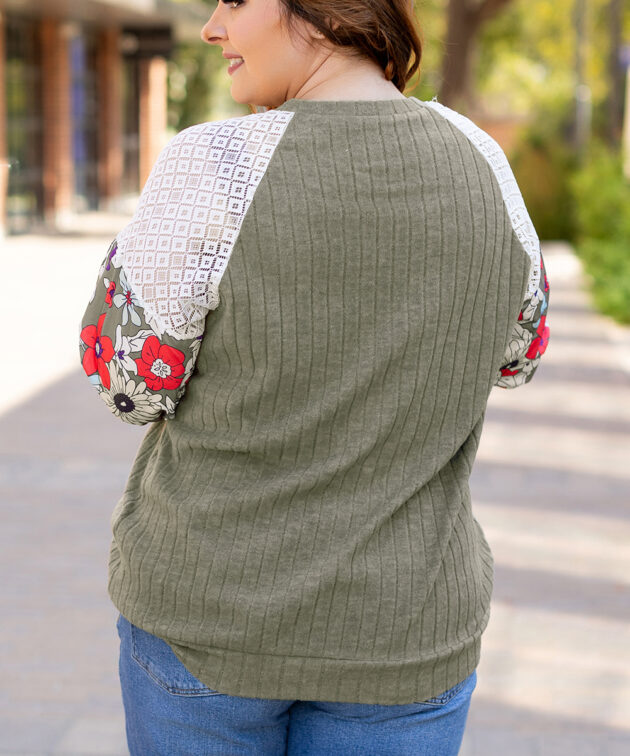 White Contrast Floral Sleeve Textured Drop Shoulder Knit Top