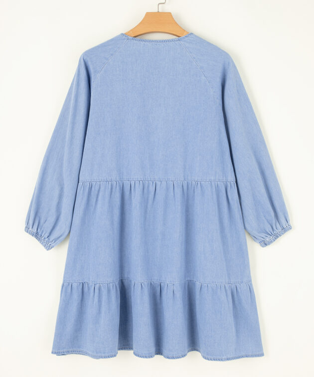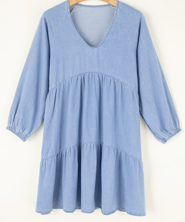 - This chambray dress features a loose fit tiered style with a v neck and puff sleeves.