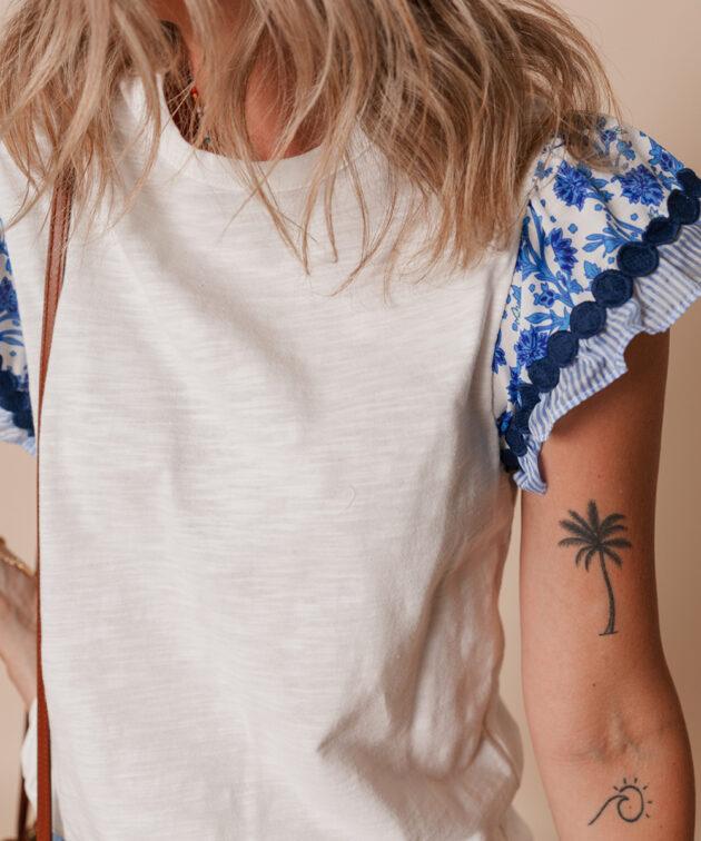 - Features a feminine printed flutter sleeve design with ricrac detail.
