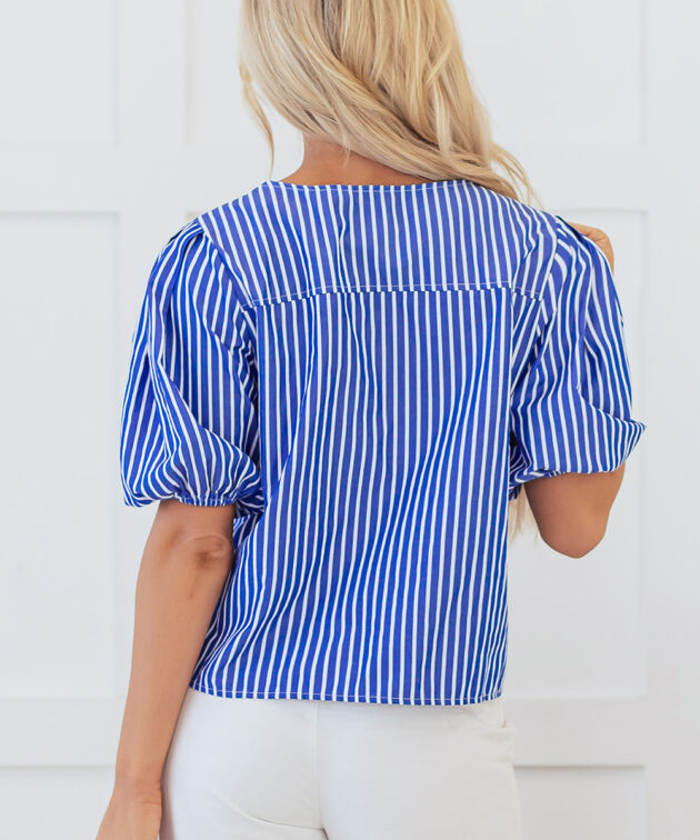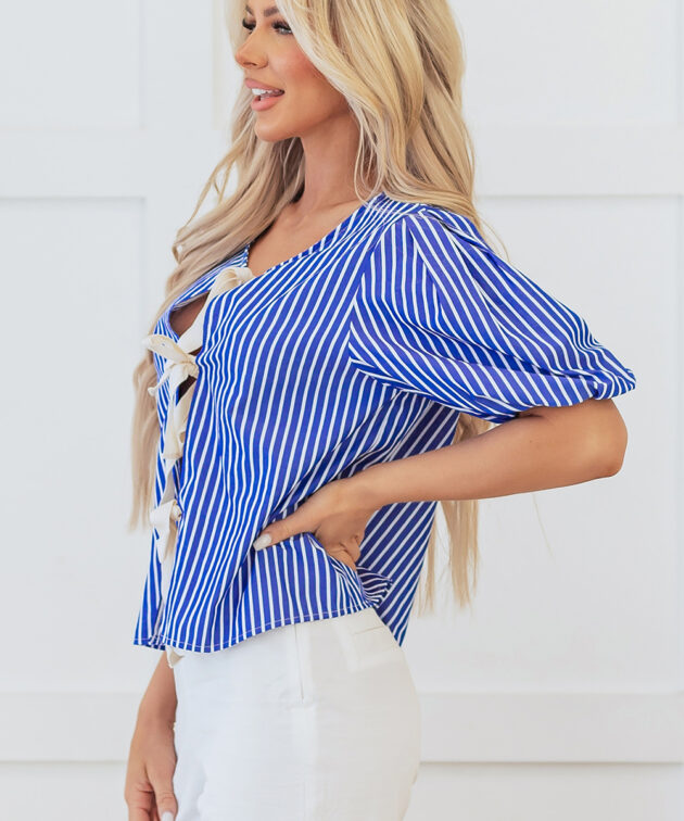 - This striped blouse is sure to add a touch of charm to your wardrobe.