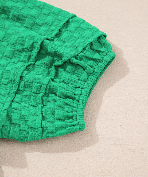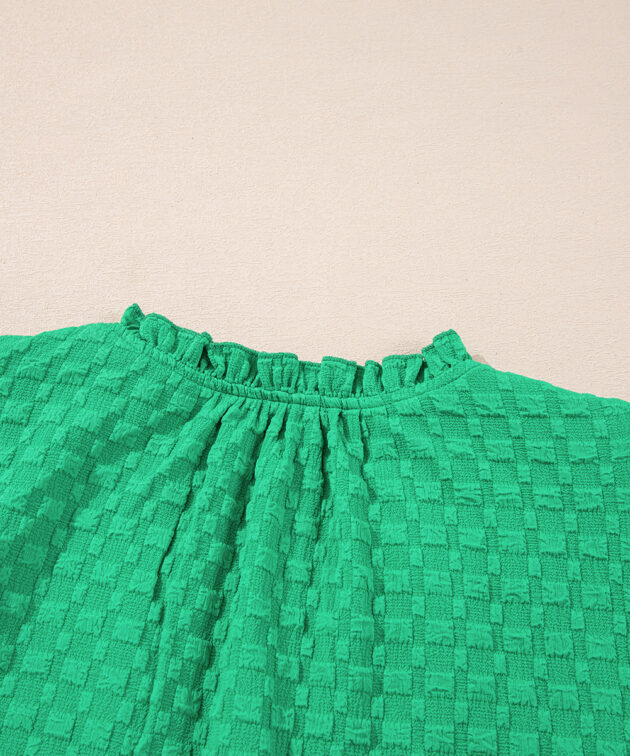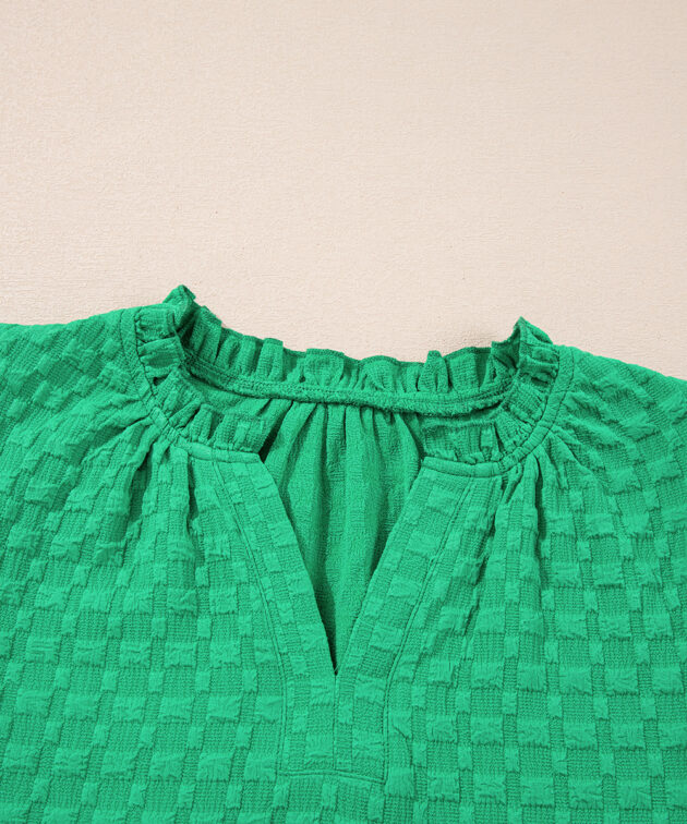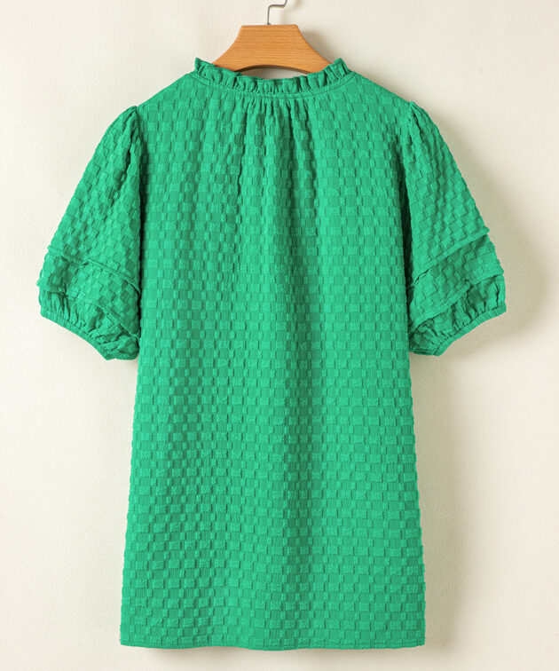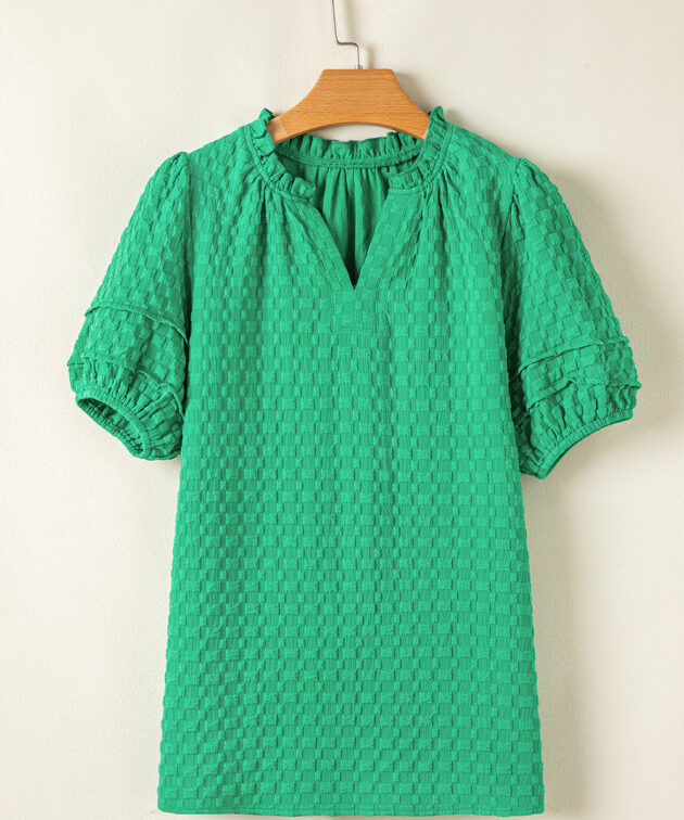 Bright Green Textured Puff Short Sleeve Notched V Neck Top