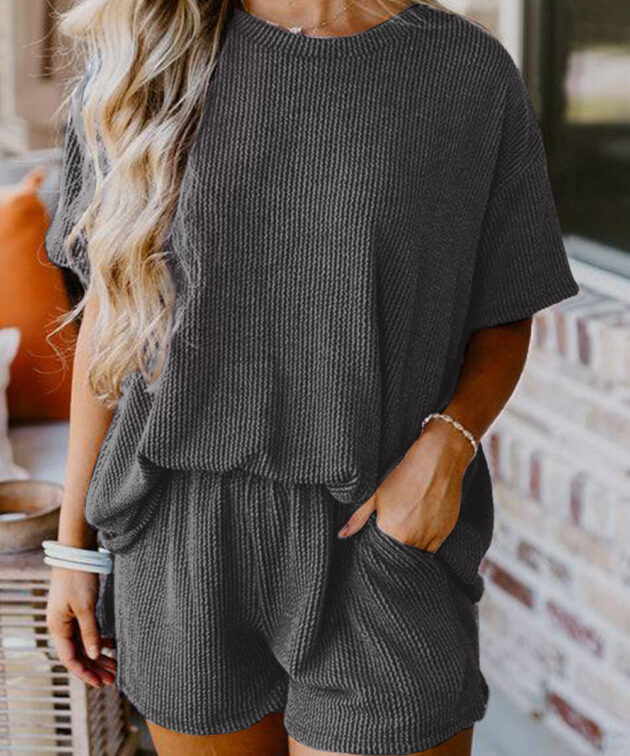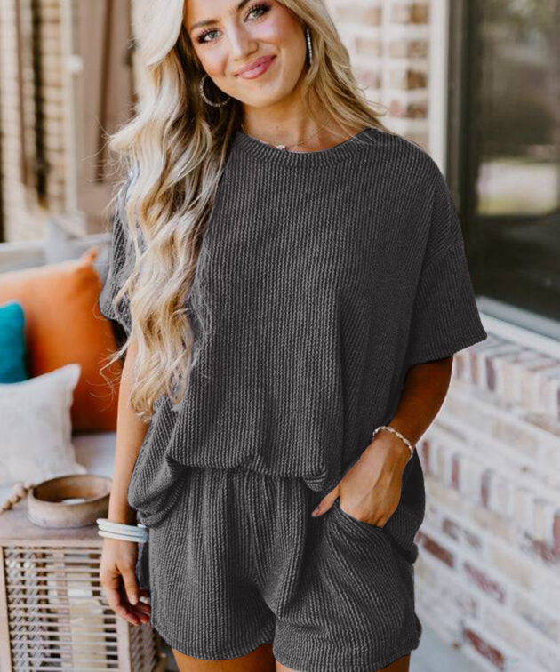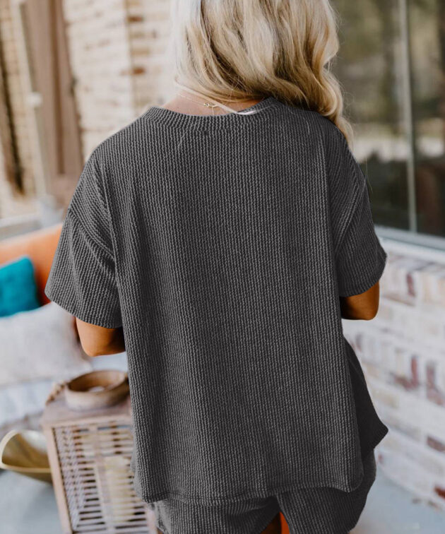 Carbon Grey Ribbed Textured Knit Loose Fit Tee and Shorts Set