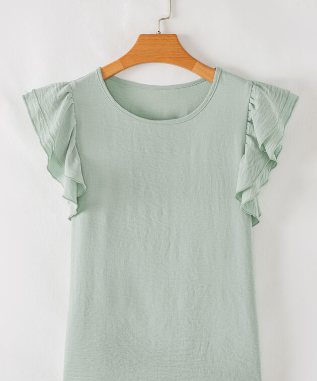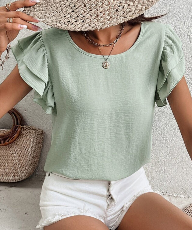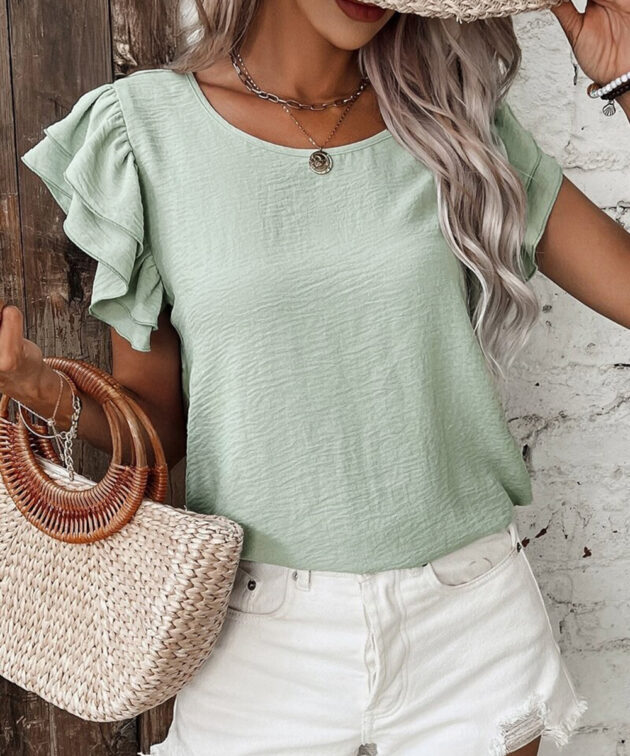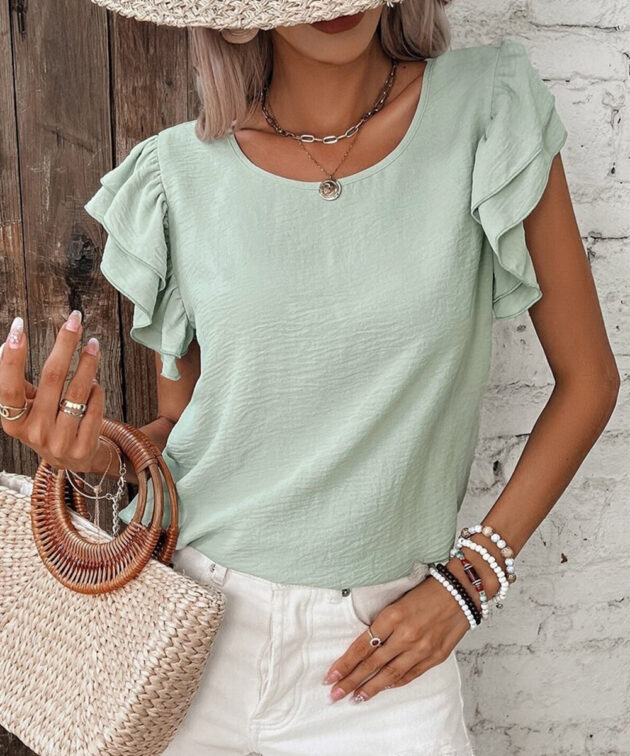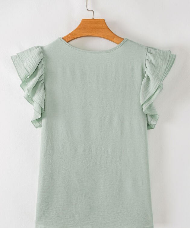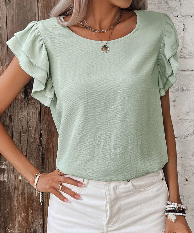 Clearly Aqua Solid Color Ruffled Short Sleeve Casual Blouse