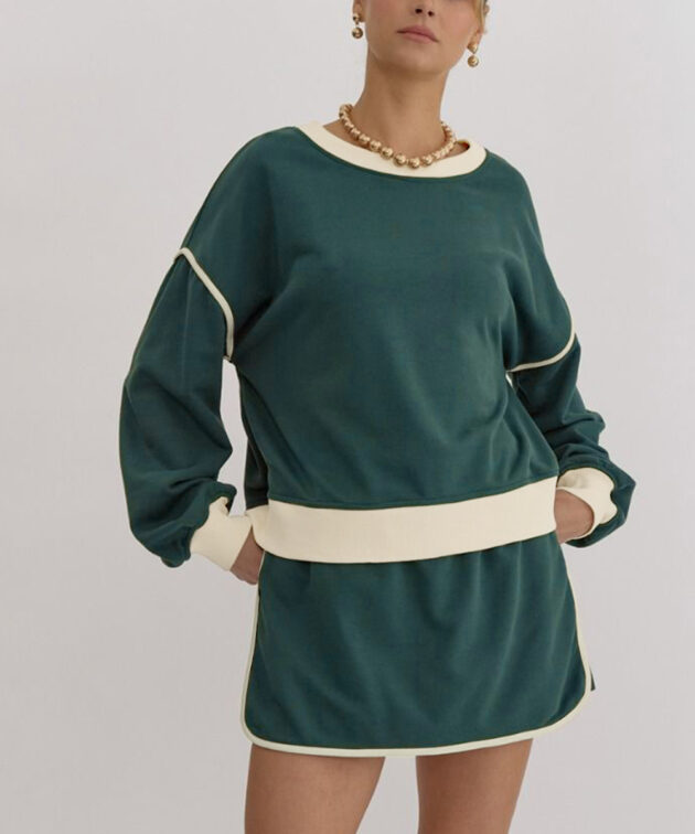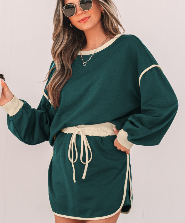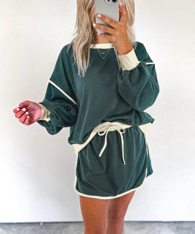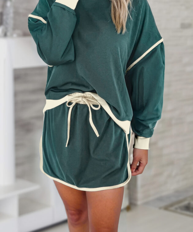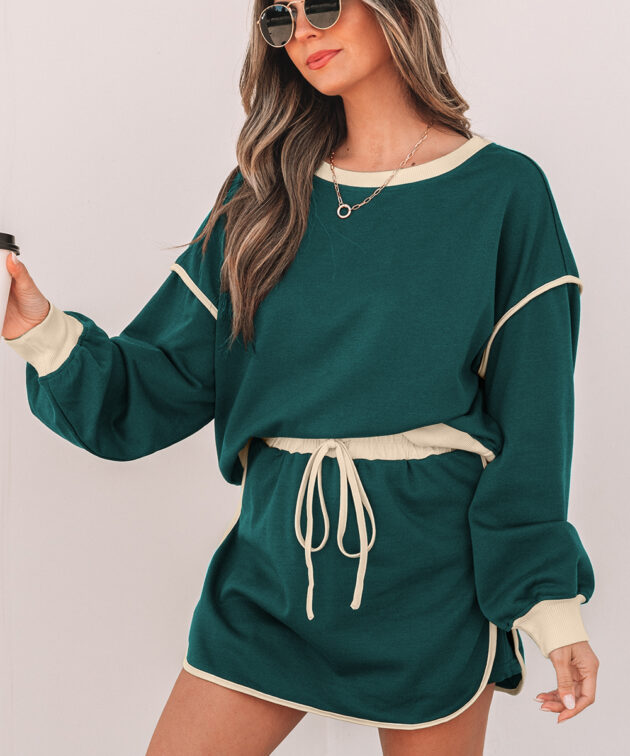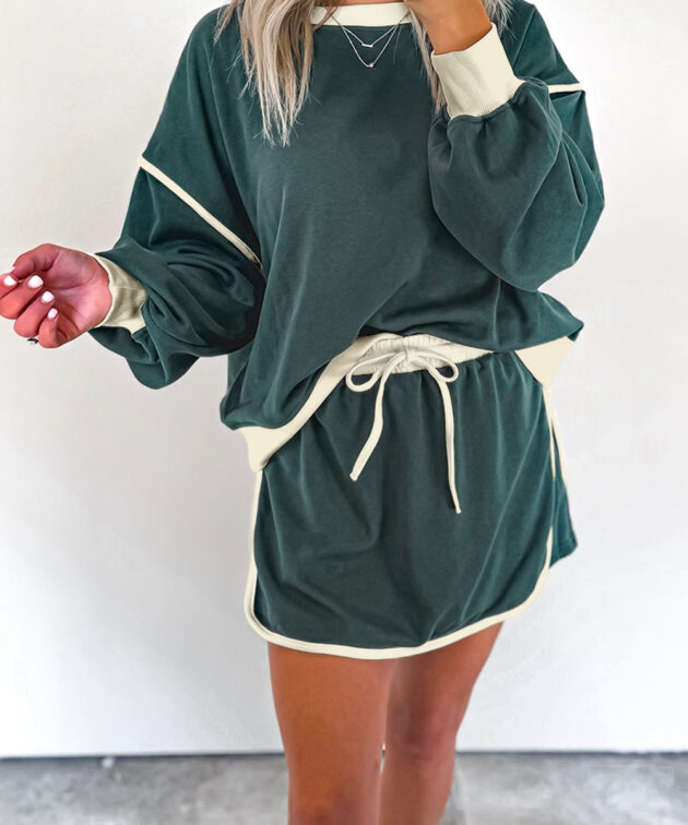 Evergreen Color Contrast Loose Pullover and Lace-up Waist Skort Set