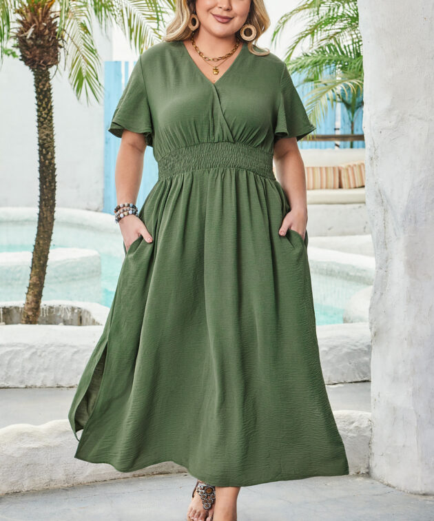 Four Leaf Clover Surplice Neckline Shirred High Waist Plus Size Maxi Dress