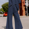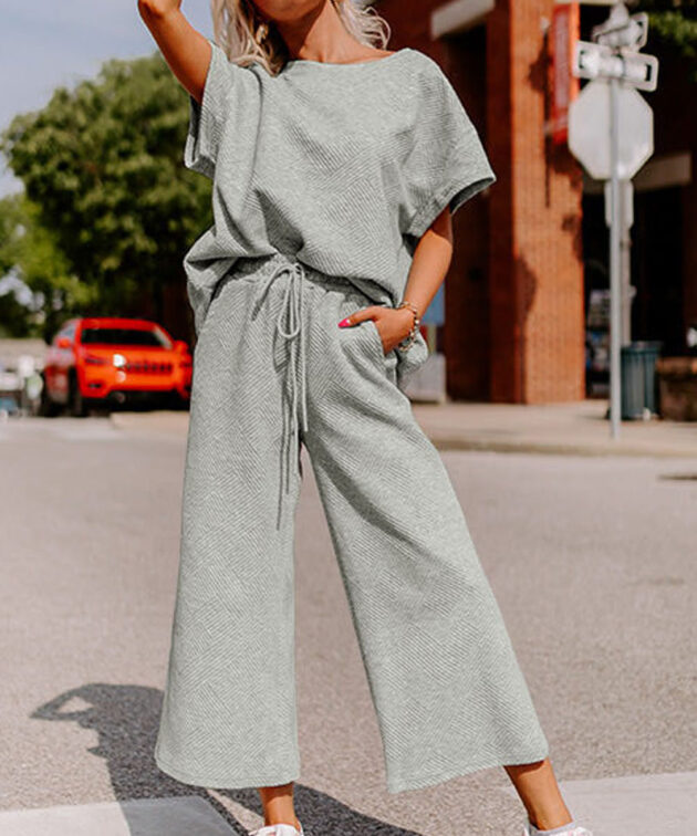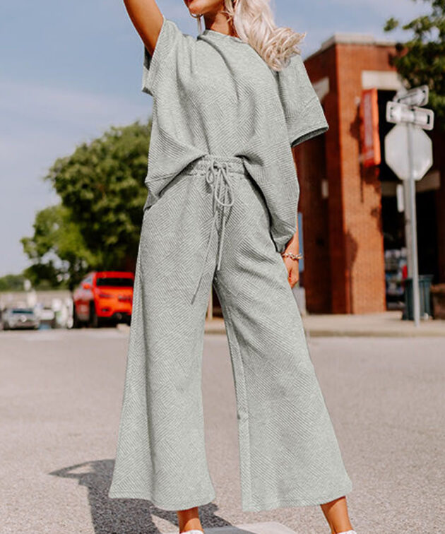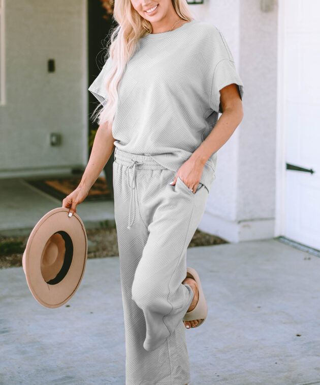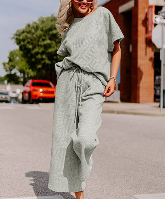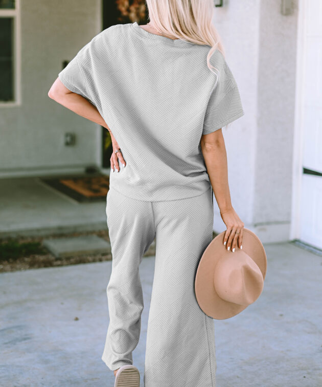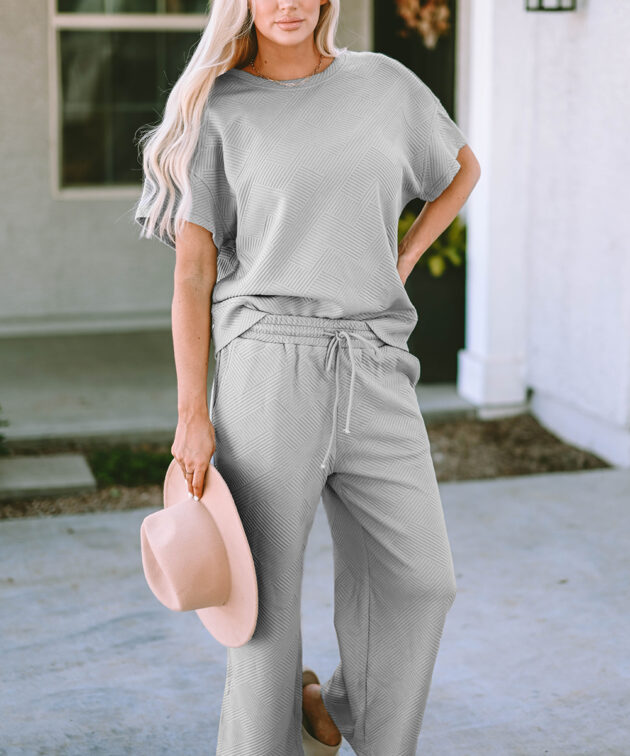 Gray Textured Loose Fit T Shirt and Drawstring Pants Set