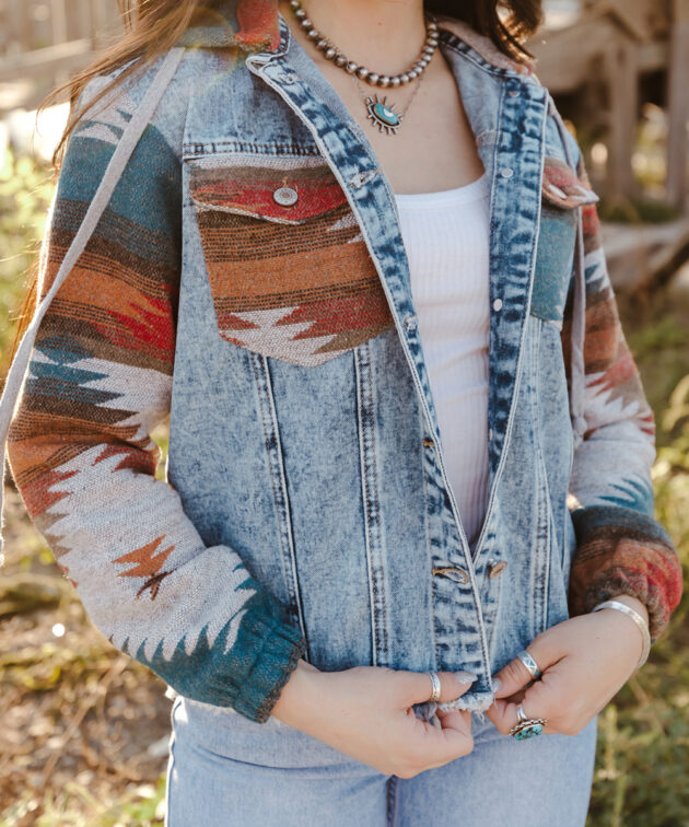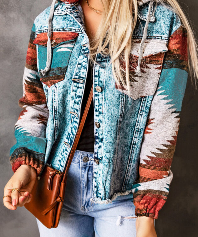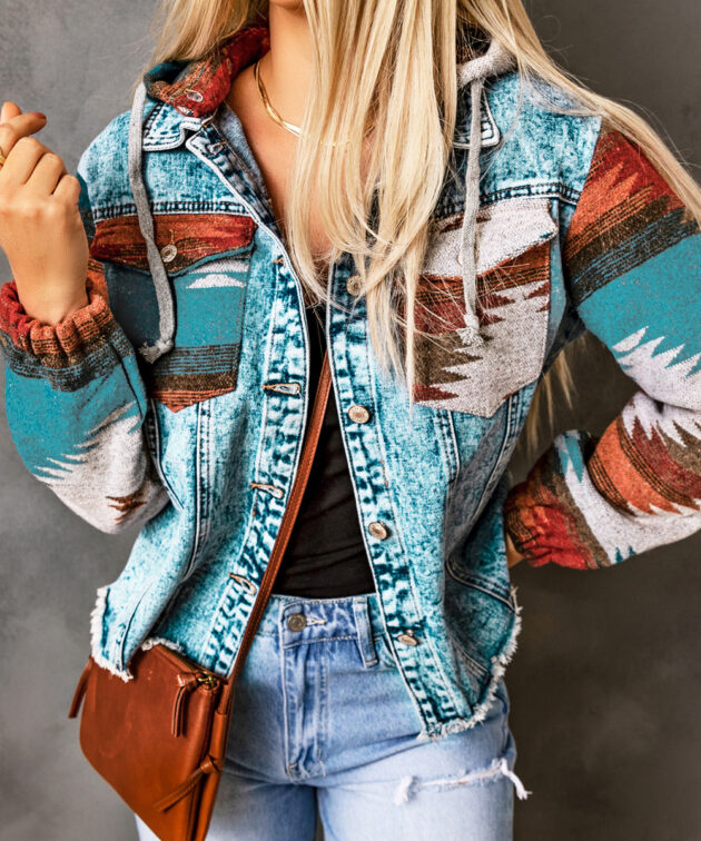 Multicolor Aztec Print Frayed Hem Denim Jacket