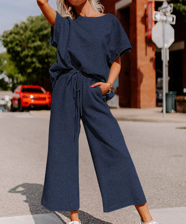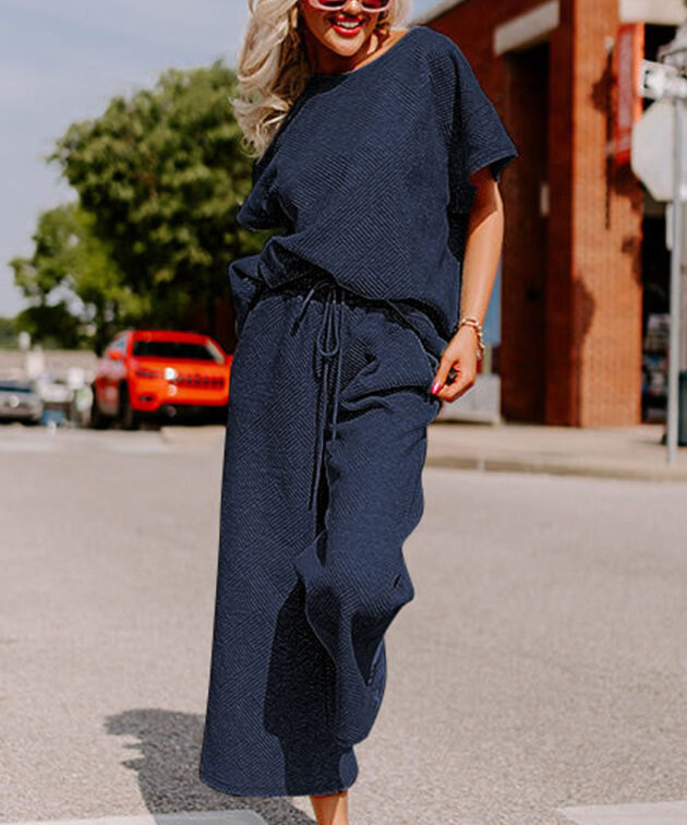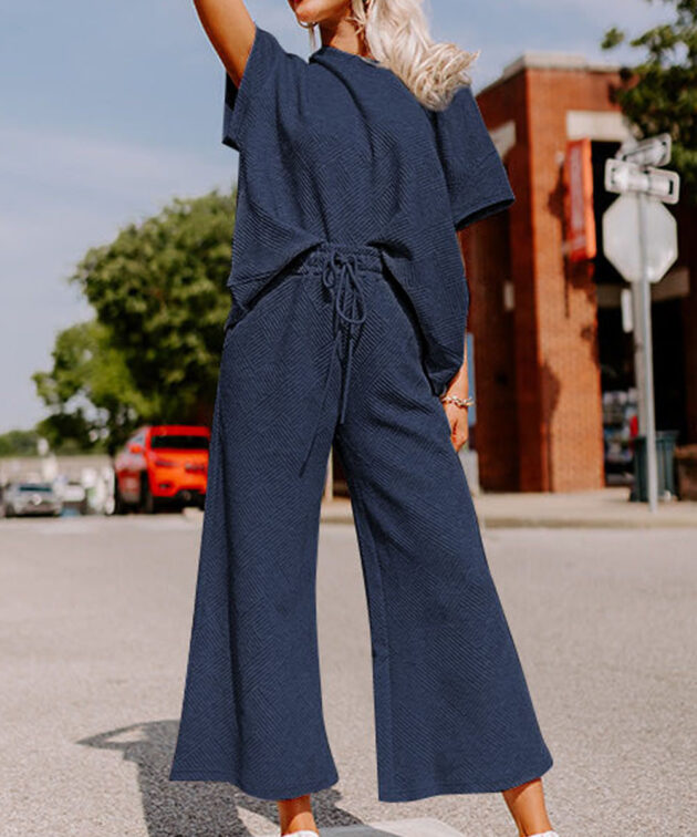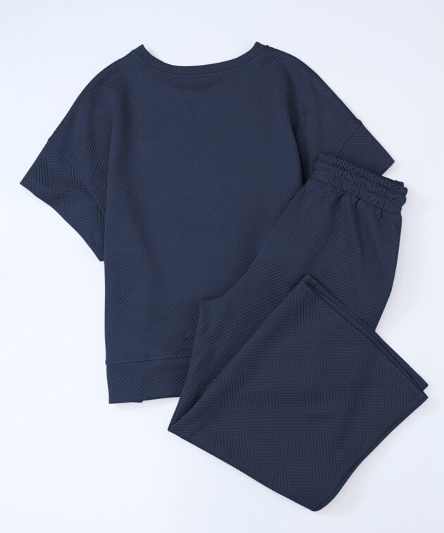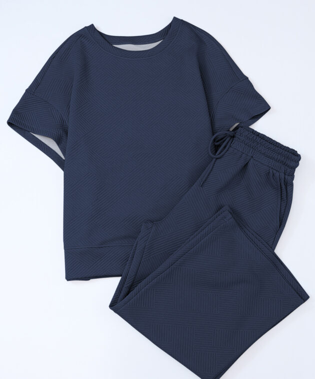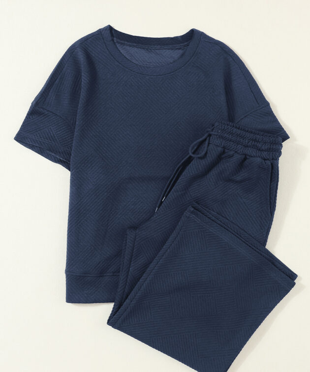 Navy Blue Textured Loose Fit T Shirt and Drawstring Pants Set