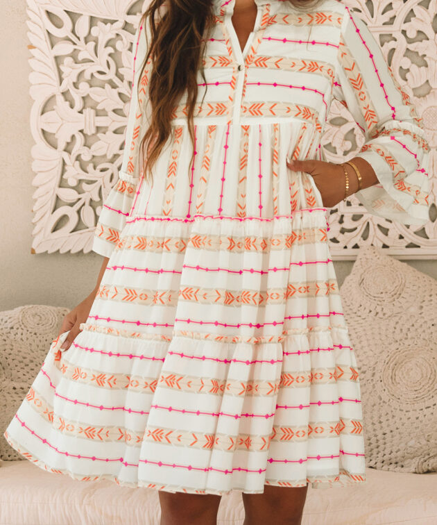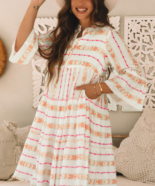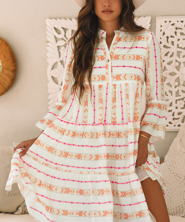 - Vibrant bohemian pattern infuses the dress with a free-spirited, artistic vibe.