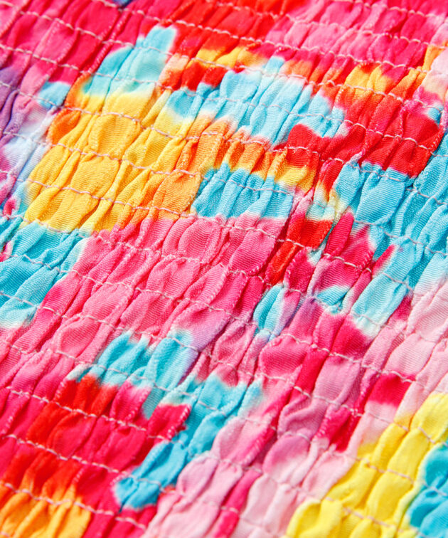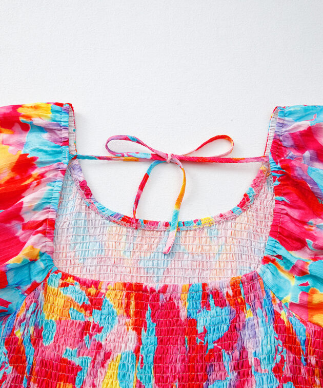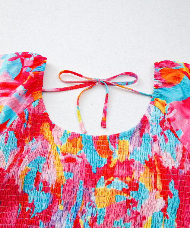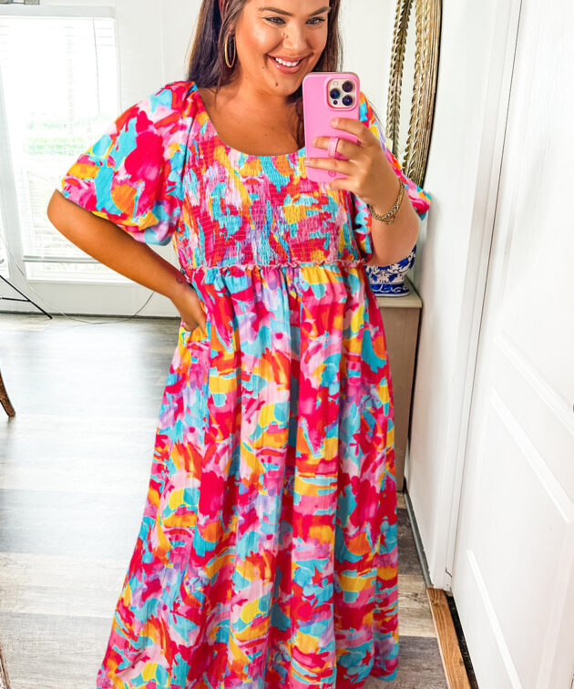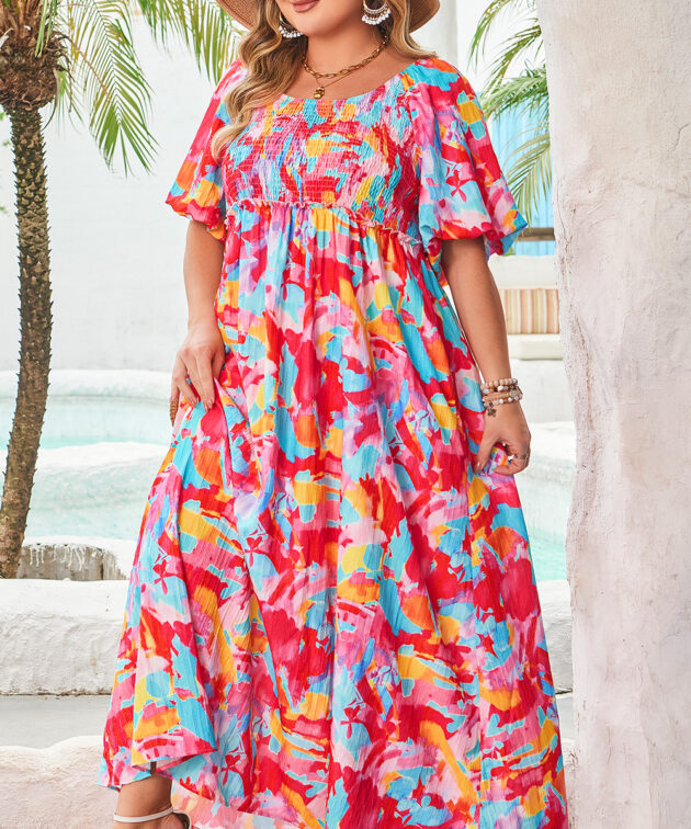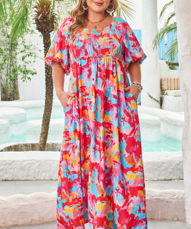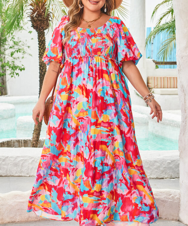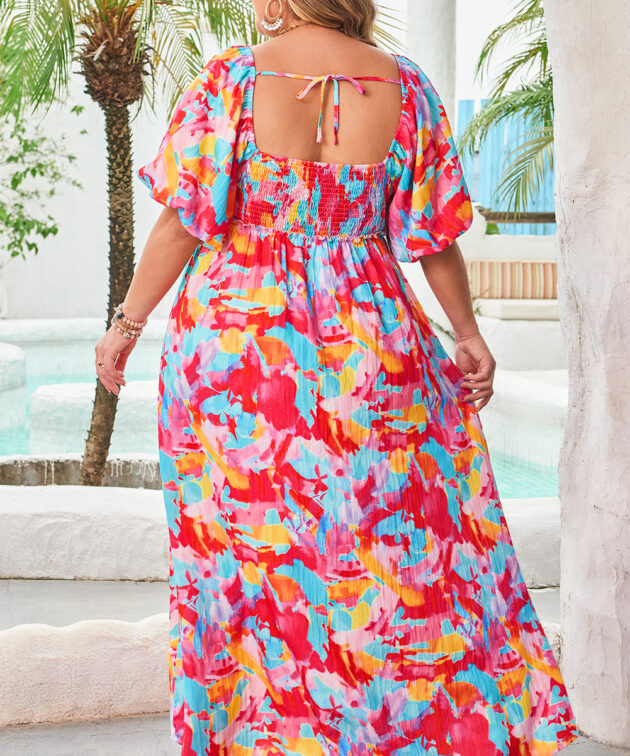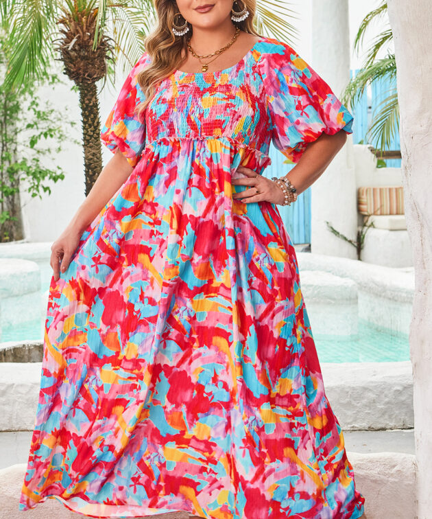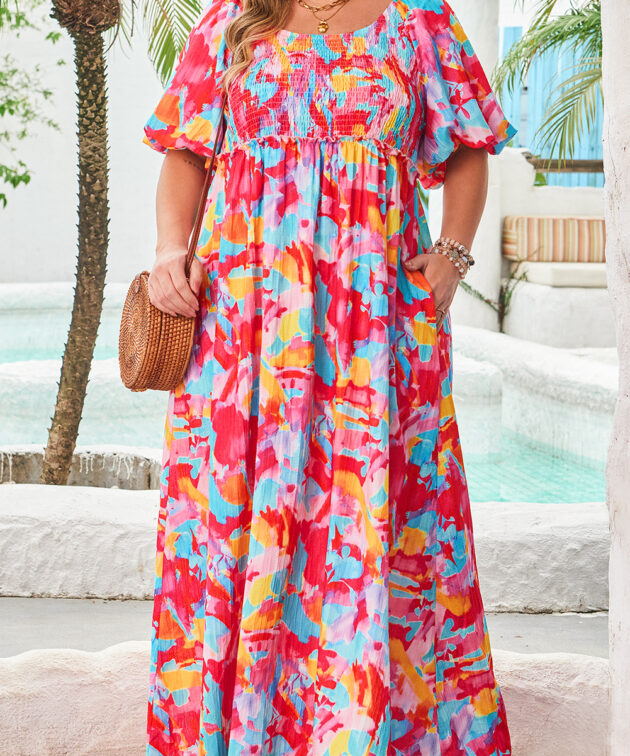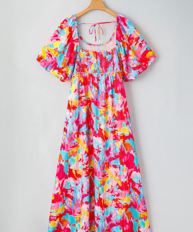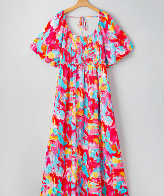Rose Abstract Printed Puff Sleeve Square Neck Smocked Bust Tied Back Plus Size Dress