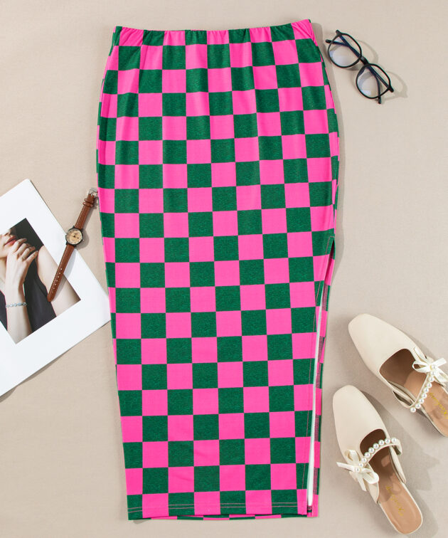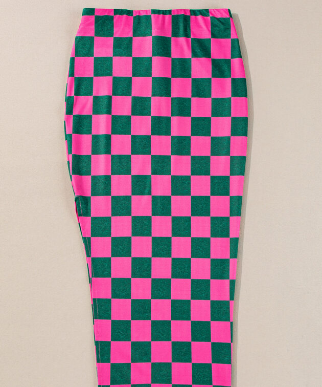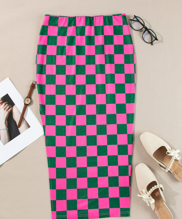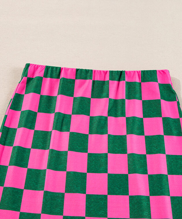 - The midi skirt is highlighted by a bold checkered print that brings a graphic and eye-catching element to the design.