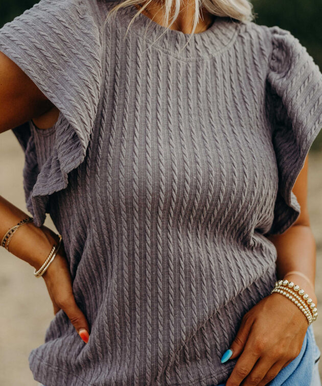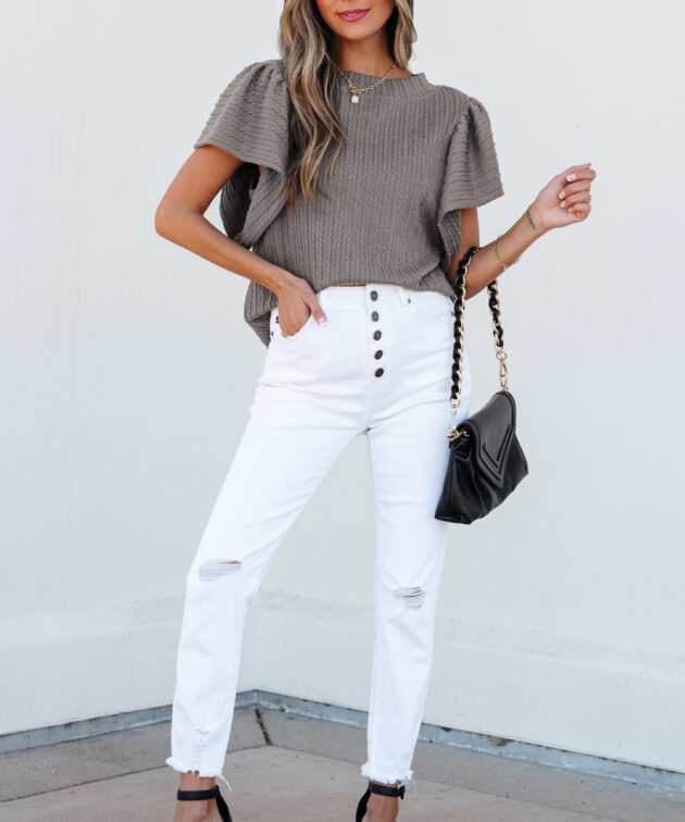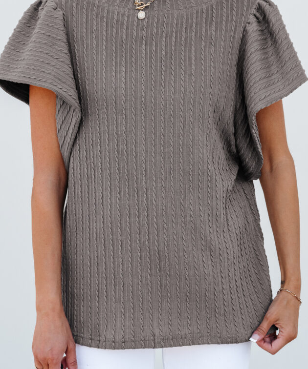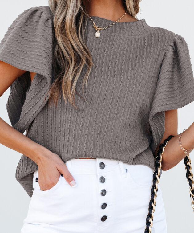 This fashion top features delicate flutter sleeves and shirring detail for a flattering fit.