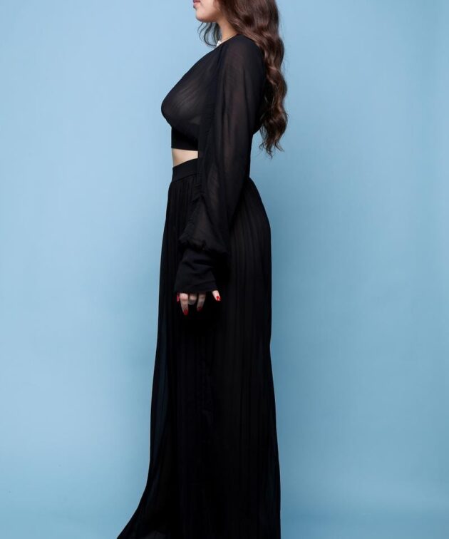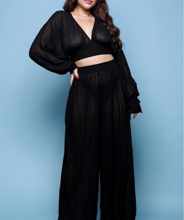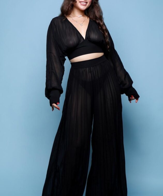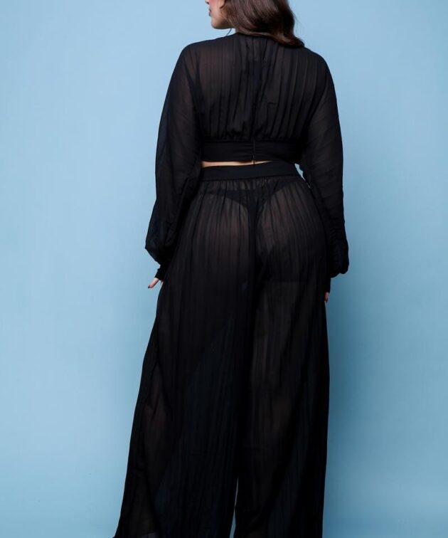 Sleeve Mesh Crop Top Pleated Wide Leg Pants Sets