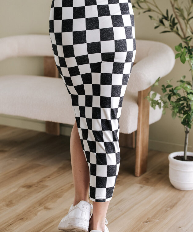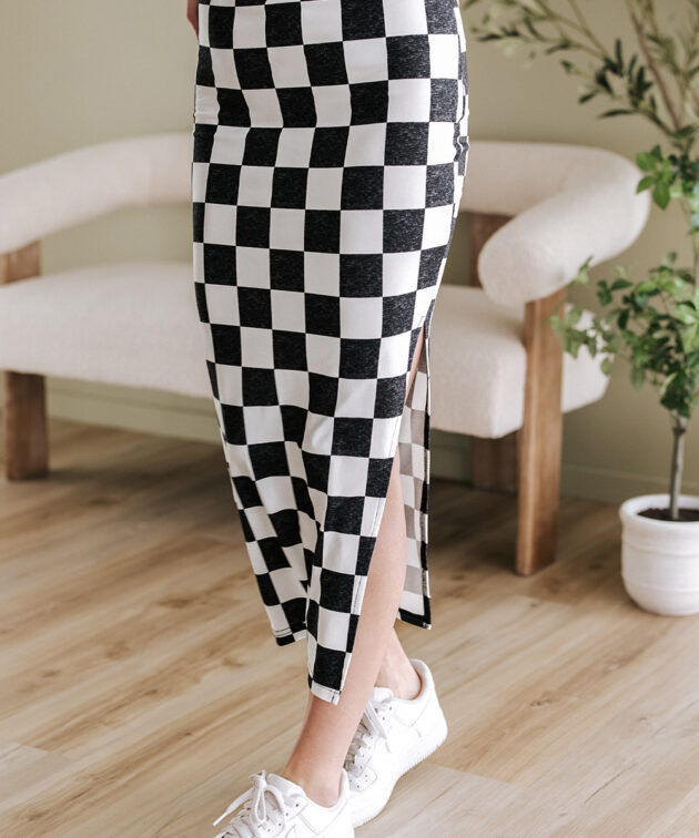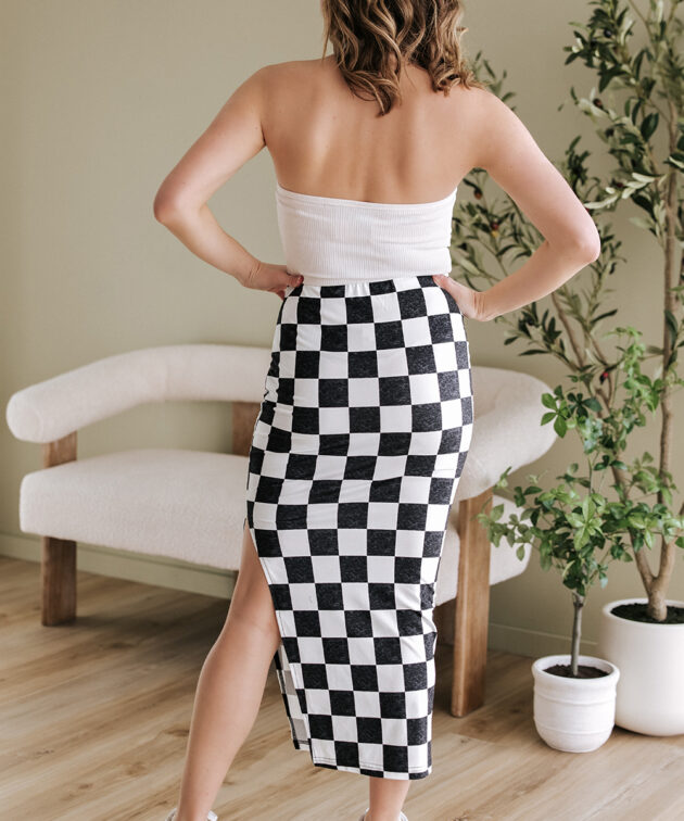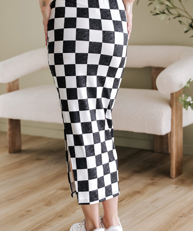 - The midi skirt is highlighted by a bold checkered print that brings a graphic and eye-catching element to the design.