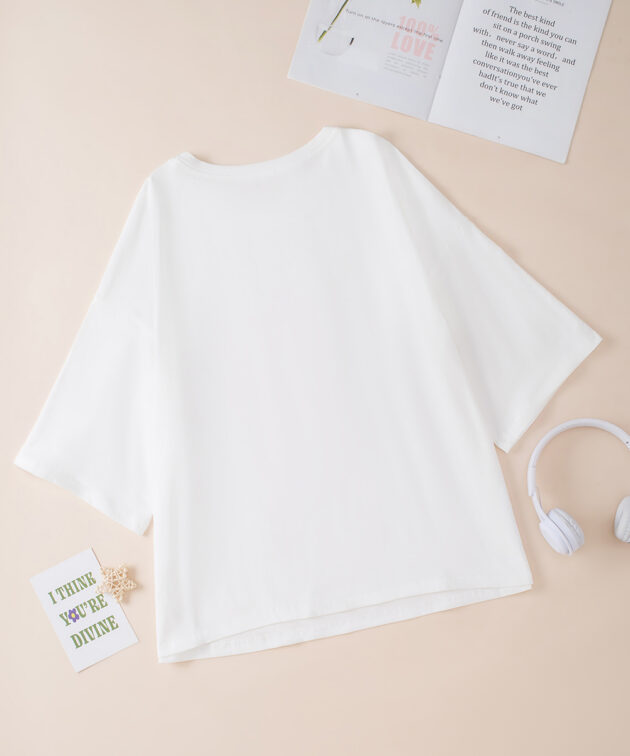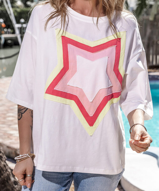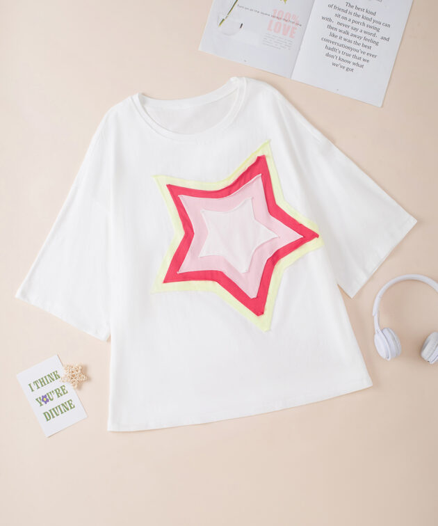 White Colorblock Star Patched Half Sleeve Oversized Tee