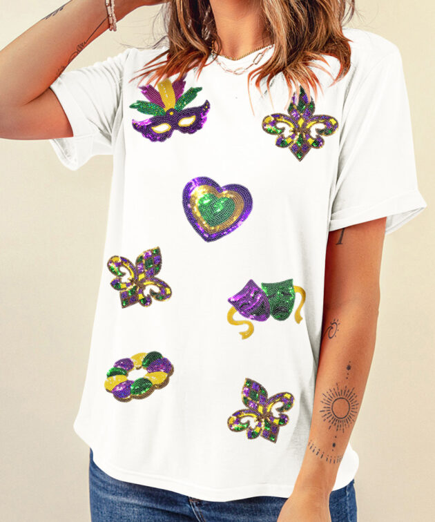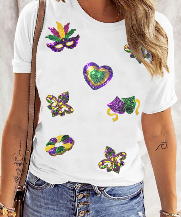 White Sequined Mardi Gras Symbolic Pattern Casual Tee