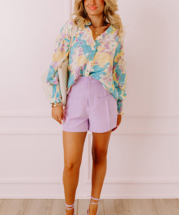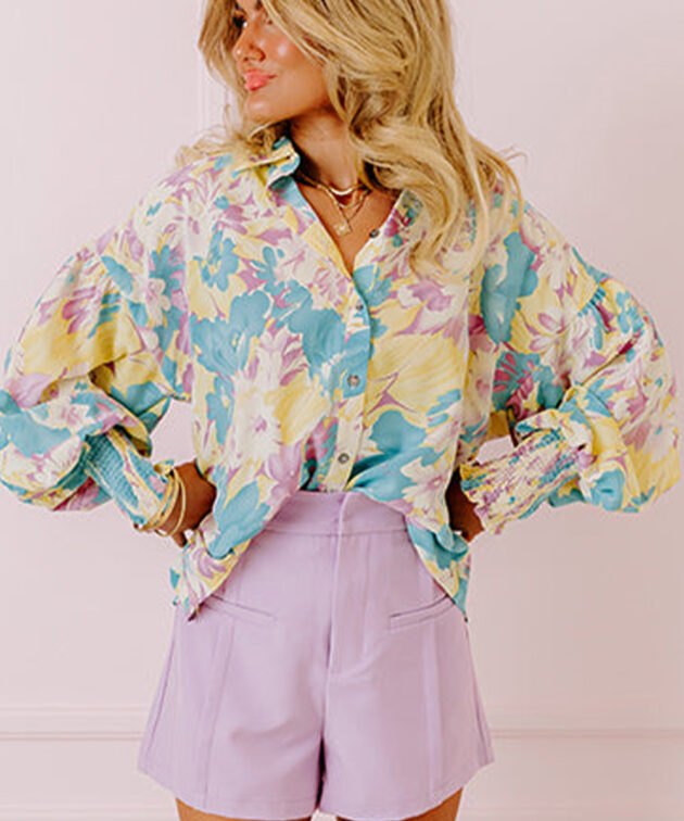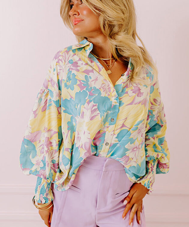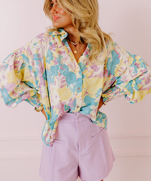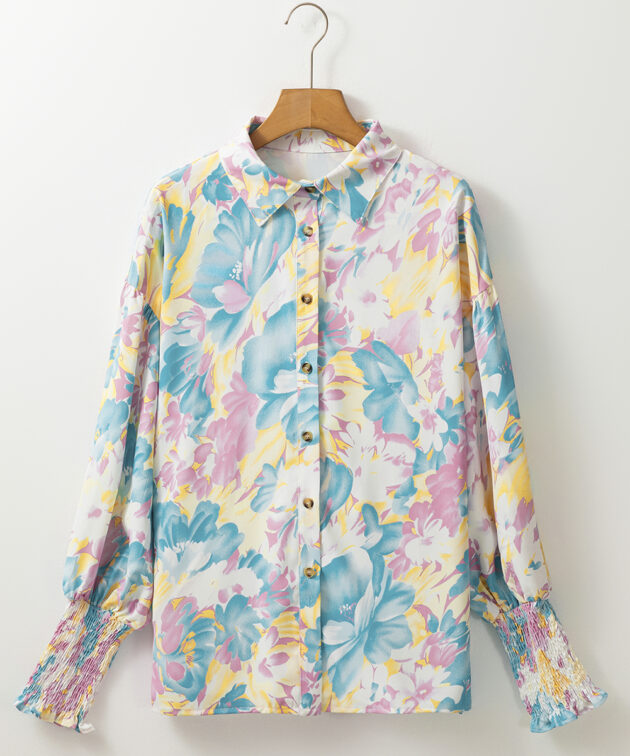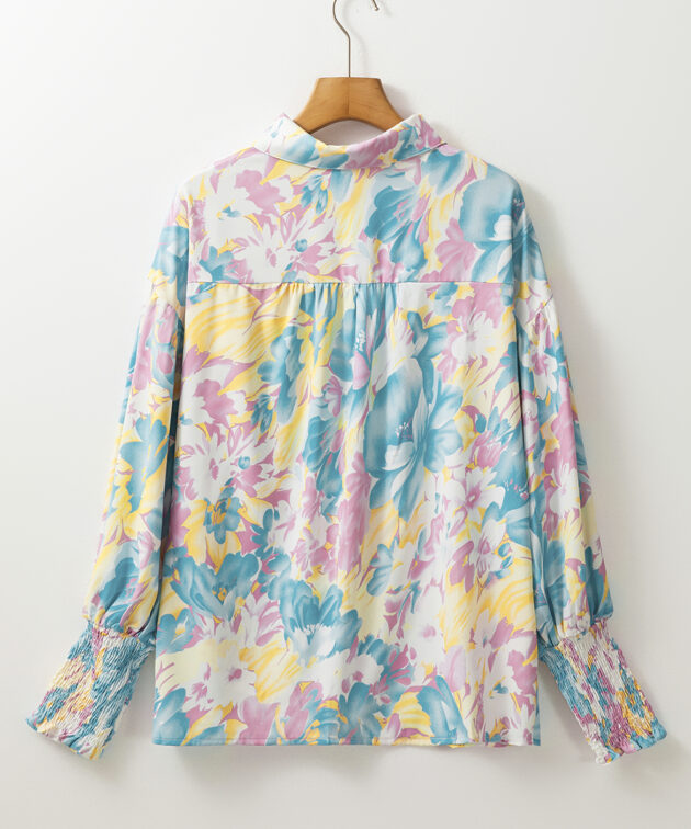 - The shirred cuffs add a feminine detail to the vibrant floral pattern.